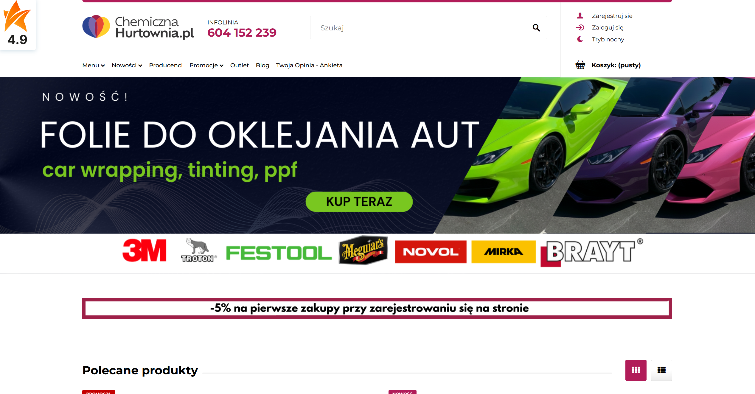 chemiczna-hurtownia.pl — B2B dla lakiernictwa i warsztatów. Duża struktura kategorii i producentów, gdzie ręczne utrzymanie jakości treści i metadanych jest kosztowne i trudne do dowiezienia konsekwentnie.