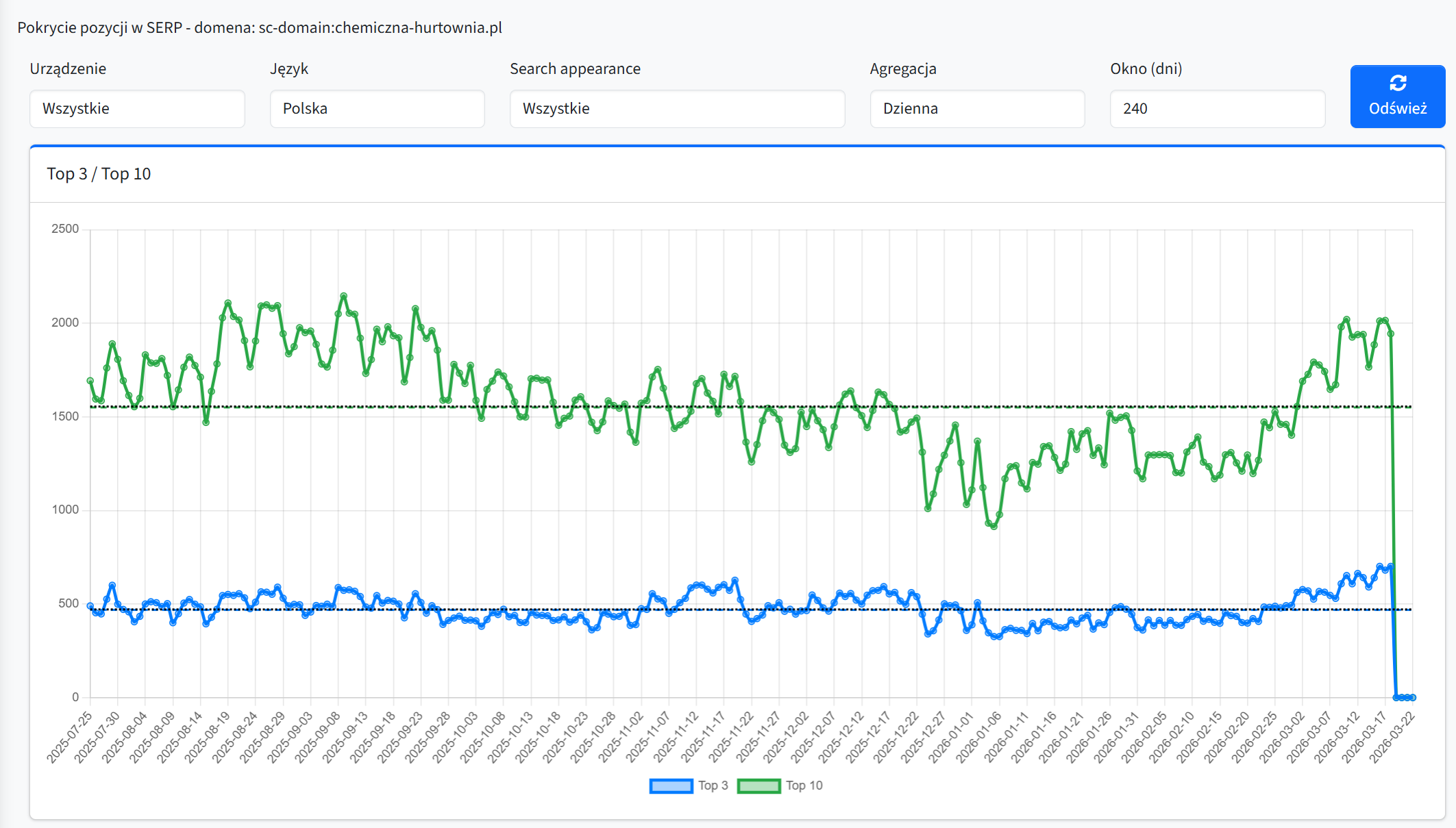 To była praca nastawiona na odbudowę “footprintu” (Top10/Top50) i rozszerzenie liczby URL-i, które realnie zbierają kliknięcia.